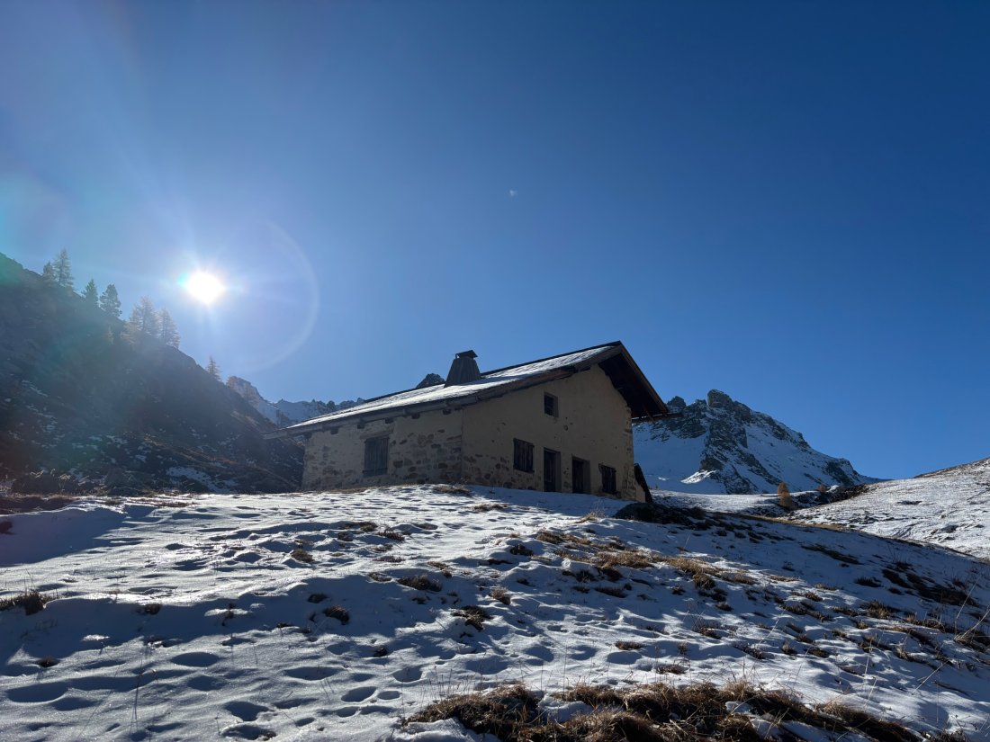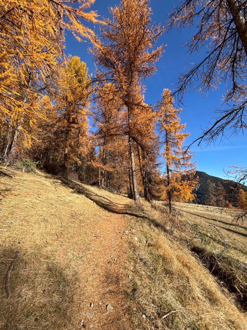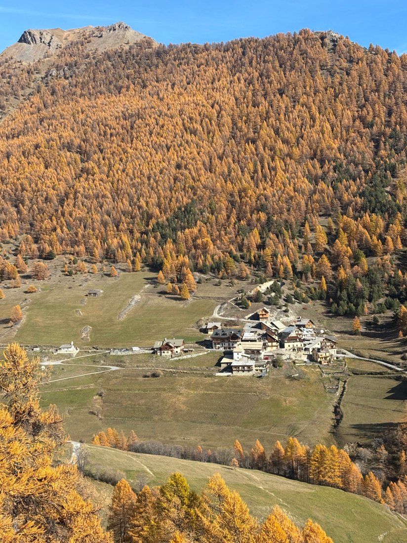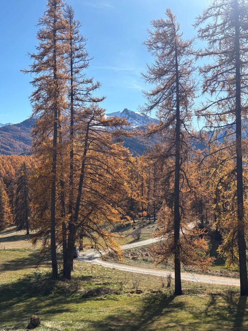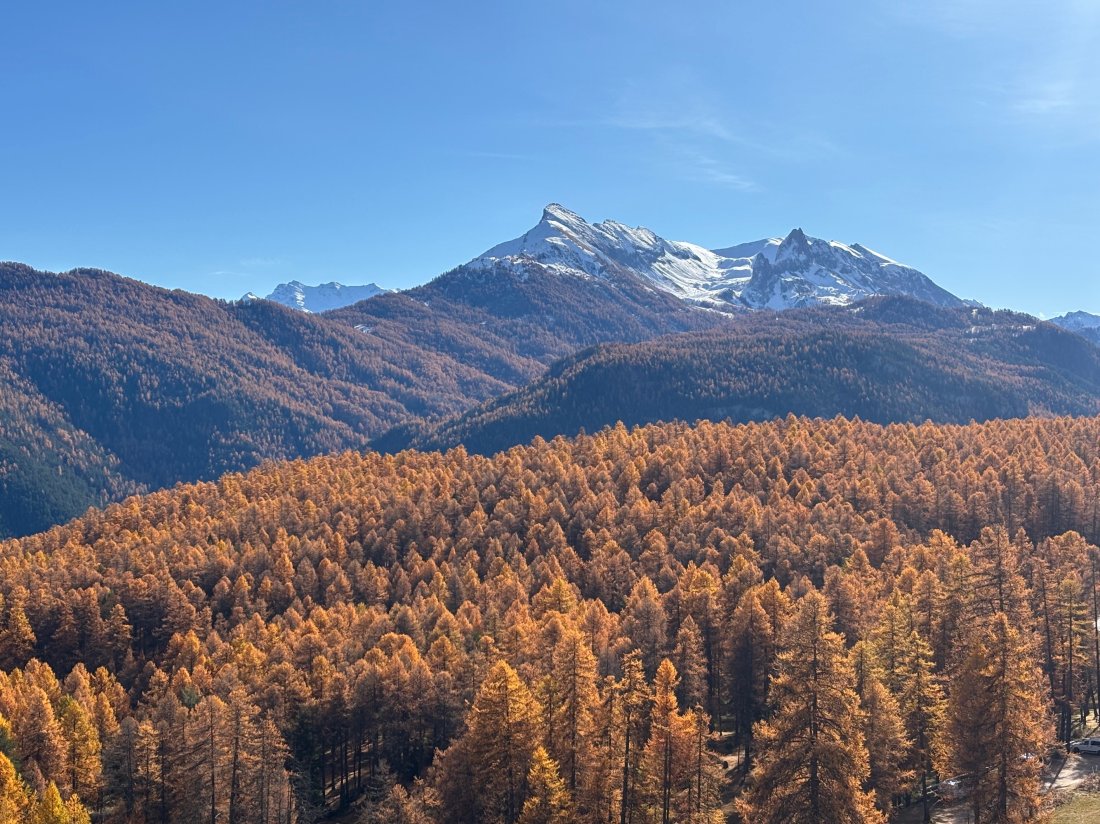 Un paysage flamboyant du Queyras, où les mélèzes dorés contrastent avec le ciel pur, encadrant le gîte La Tanière de l'Izoard, havre de tranquillité au cœur d’une nature automnale spectaculaire.