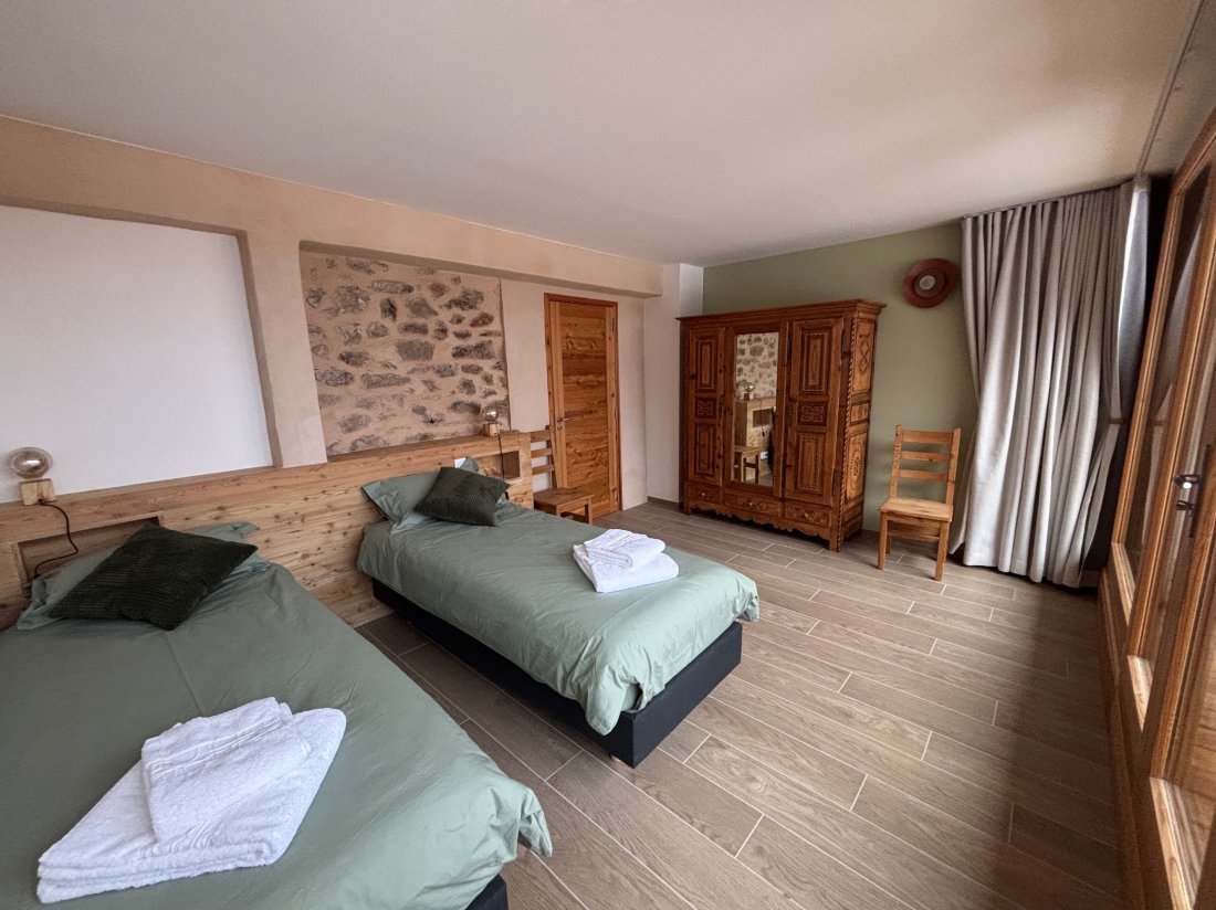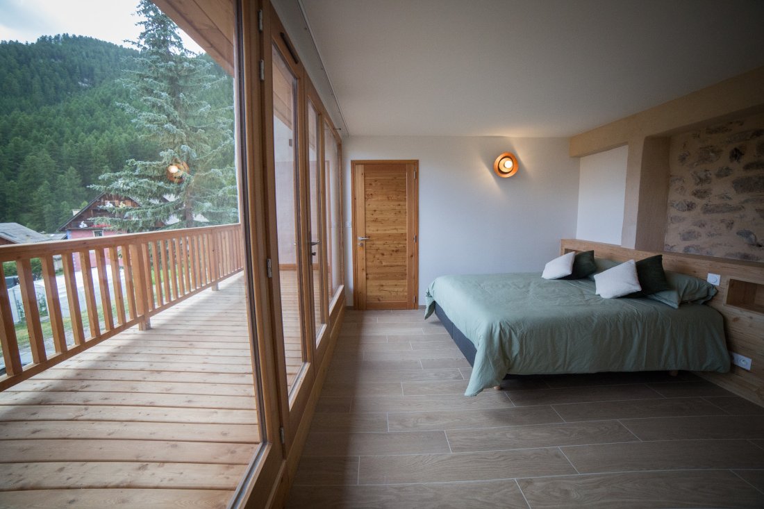 Chambre lumineuse exposée plein Sud, dotée d'un grand lit confortable, d’un balcon privatif offrant une vue dégagée, et d’une élégante salle de bain avec baignoire pour un séjour tout confort à La Tanière de l’Izoard.
